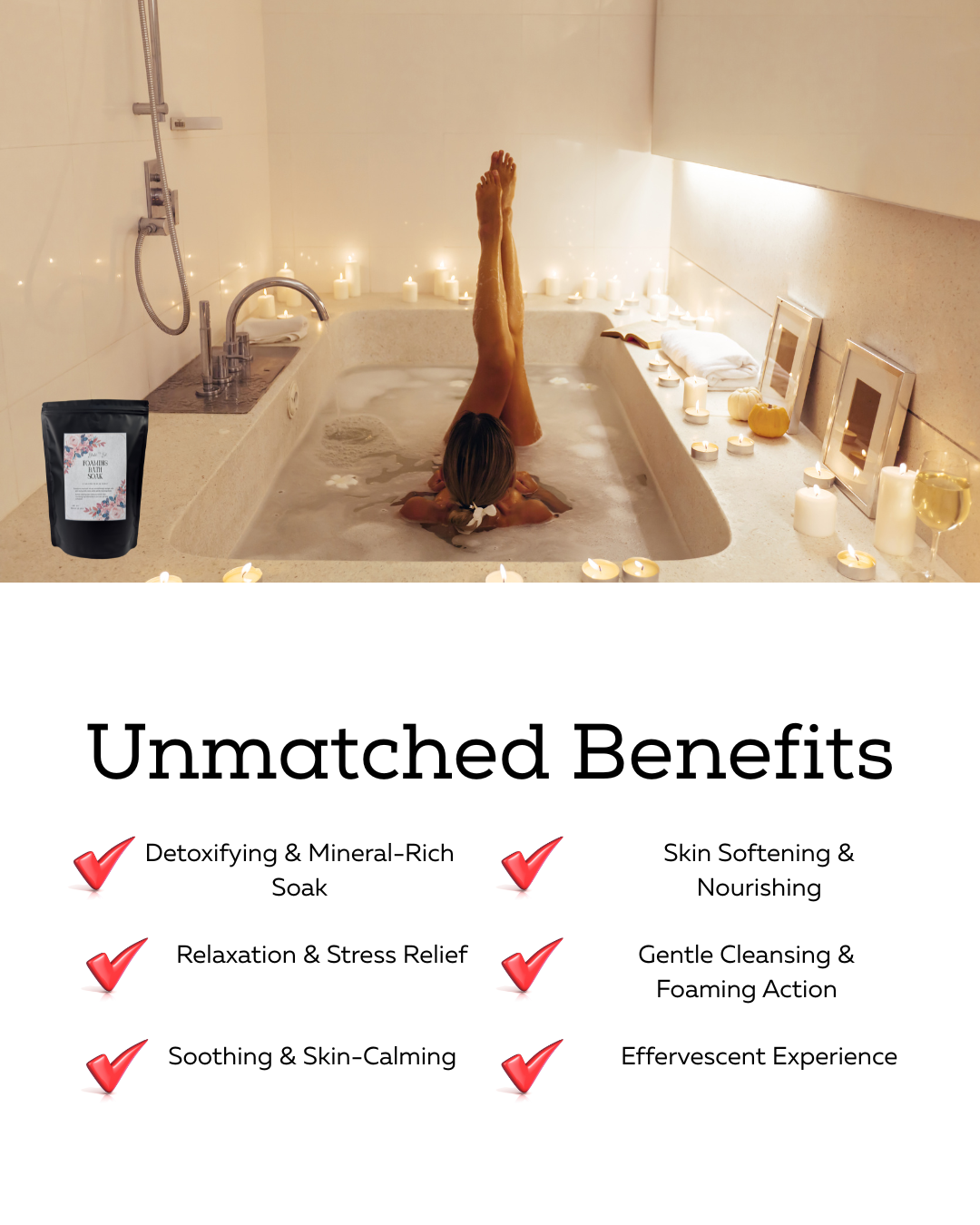- Deep Muscle Relaxation & Stress Relief Infused with magnesium-rich Epsom salt and mineral-dense Himalayan salt, this soak helps ease muscle tension, reduce fatigue, and calm the nervous system, perfect for unwinding after a long day.