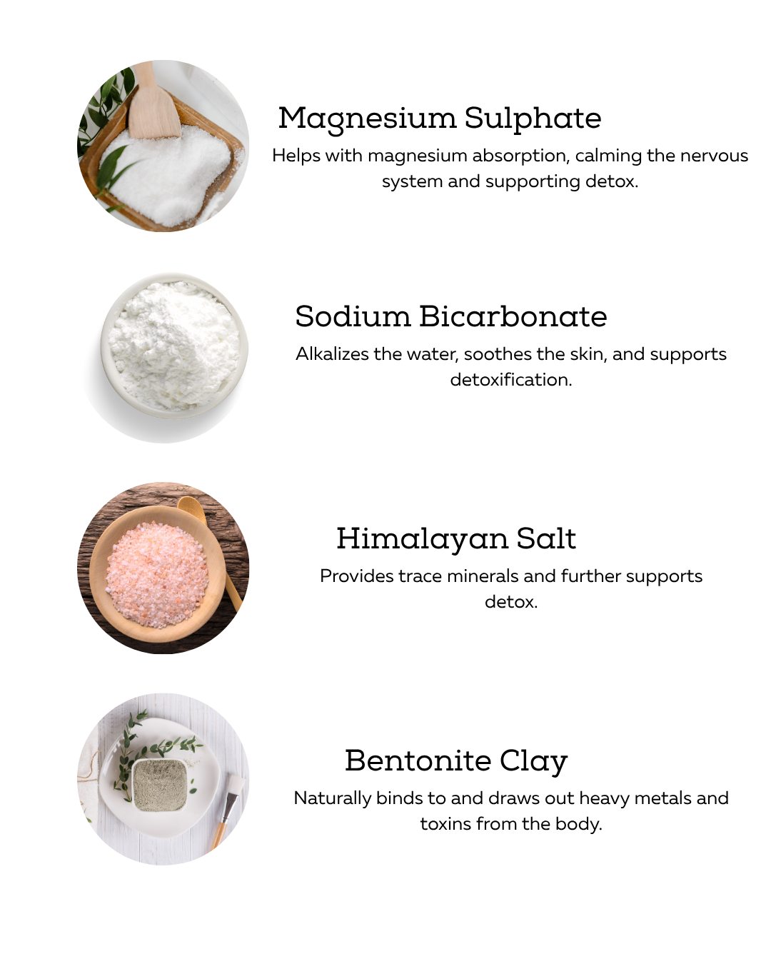 Each ingredient serves a specific purpose: Bentonite Clay: A powerful, natural detoxifier that binds to heavy metals and impurities through the skin. Magnesium Sulfate (Epsom Salt): Helps soothe the body and mind by replenishing magnesium — known to support mood, sleep, and sensory regulation. Himalayan Pink Salt: Detoxifies and balances the skin with over 80 trace minerals. Why You’ll Love It: All-natural, safe for kids Ideal for calming bedtime routines Comes with a scoop for easy use No synthetic fragrances or harsh chemicals